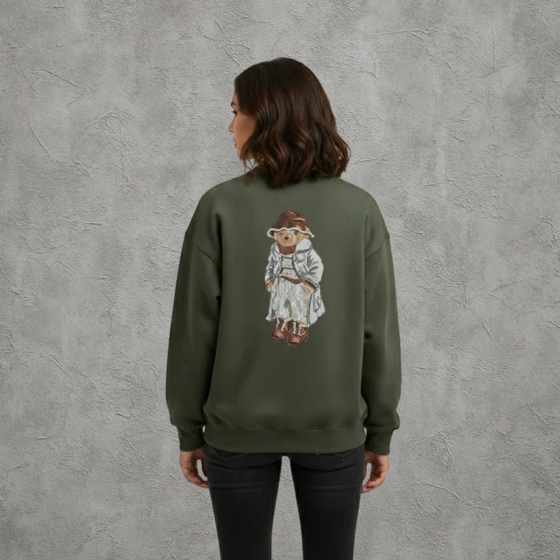 Ayı baskılı sweatshirt, oversize yeşil sweatshirt, DTF baskılı sweatshirt ve %100 pamuk kışlık sweatshirt arayanlar için hem şık hem konforlu bir üründür.